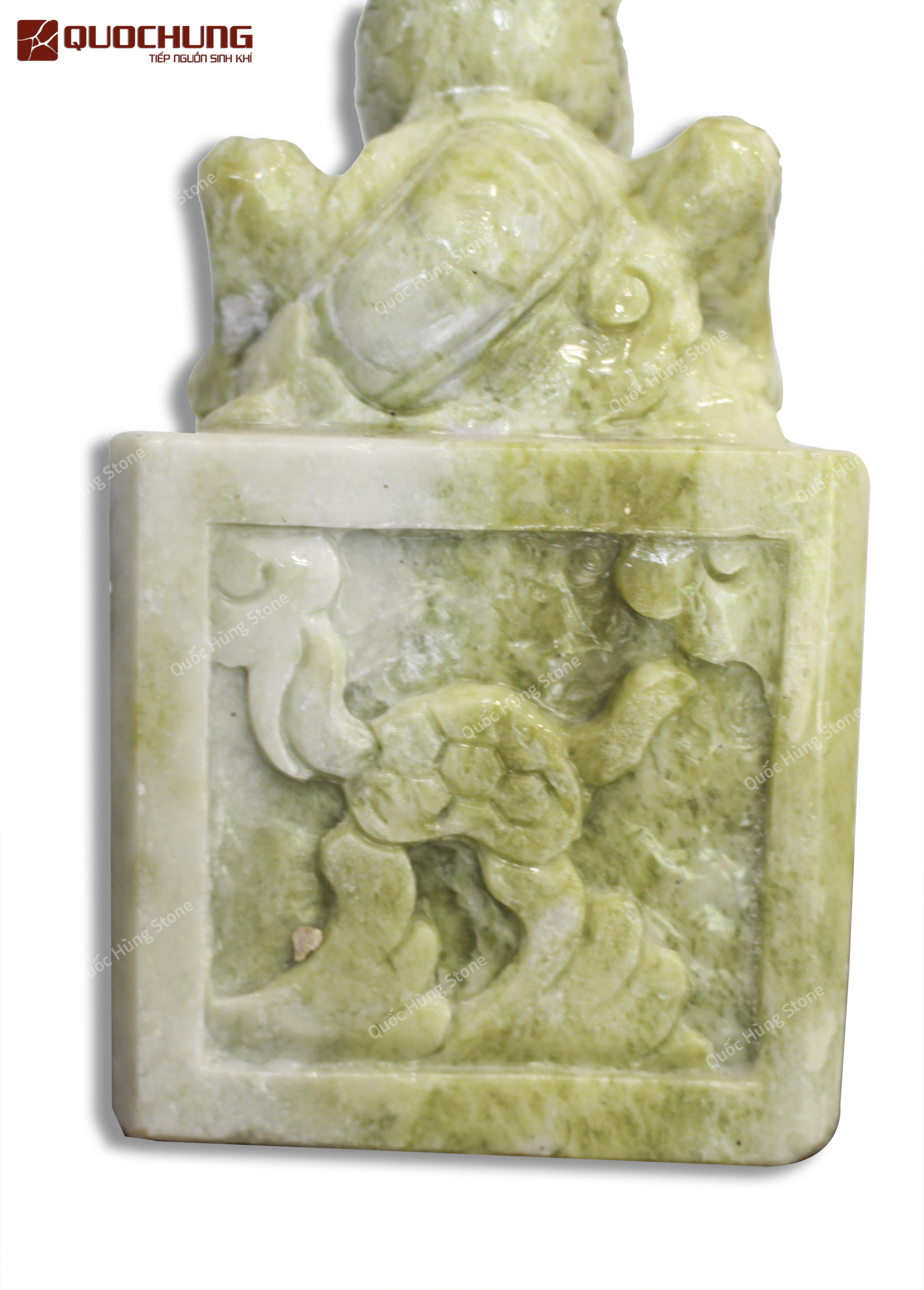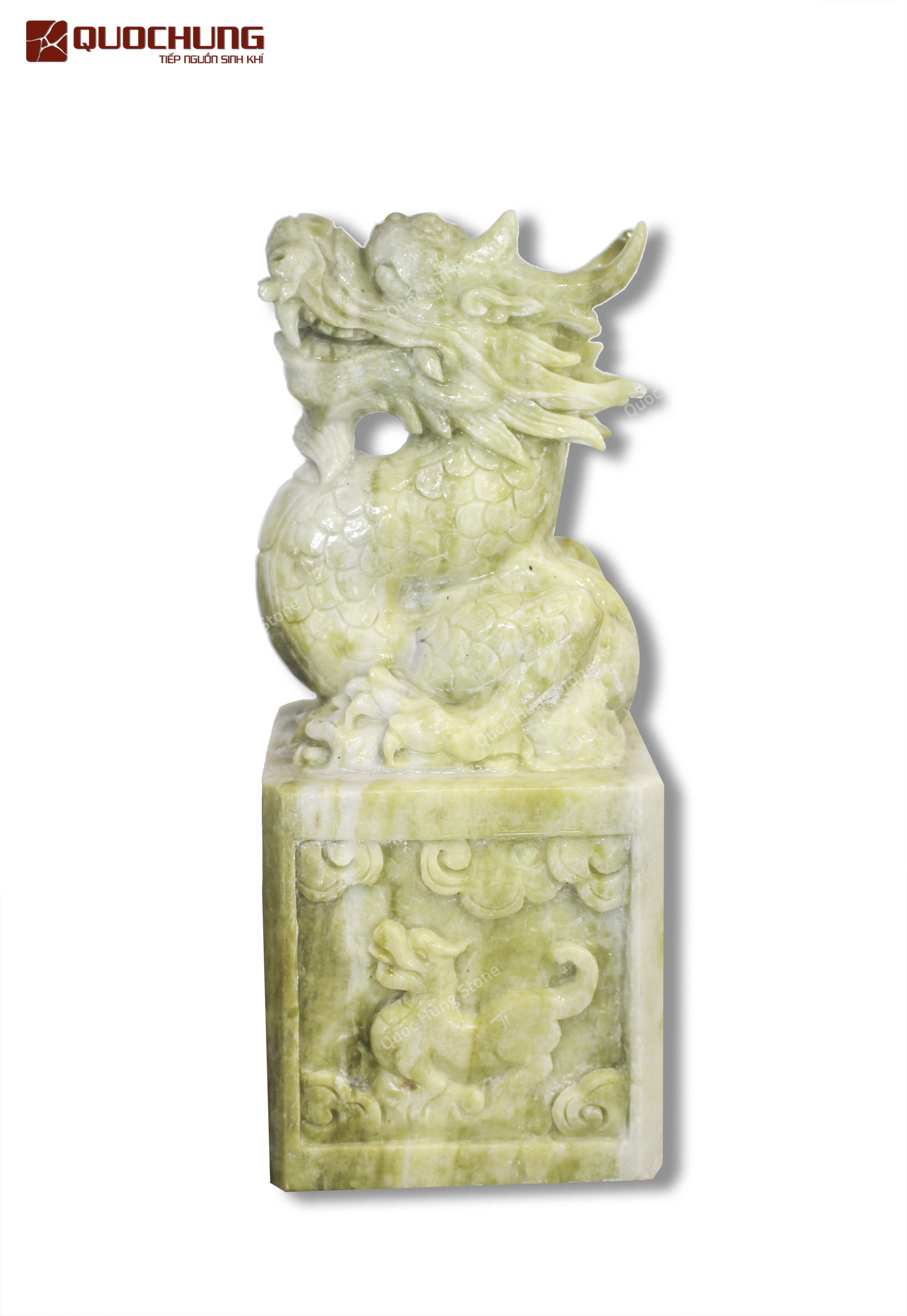 - Chất Liệu Đá Serpentine: Đá Serpentine là loại đá tự nhiên màu xanh lá, được yêu thích trong phong thủy nhờ khả năng thu hút may mắn và xua đuổi năng lượng tiêu cực. Đặc tính nổi bật của Serpentine là mang lại cảm giác bình yên, giúp thư giãn và giảm căng thẳng. Với độ bền cao và vẻ đẹp sang trọng, đá Serpentine thích hợp để chế tác các vật phẩm phong thủy mang tính quyền uy như Ấn Rồng.