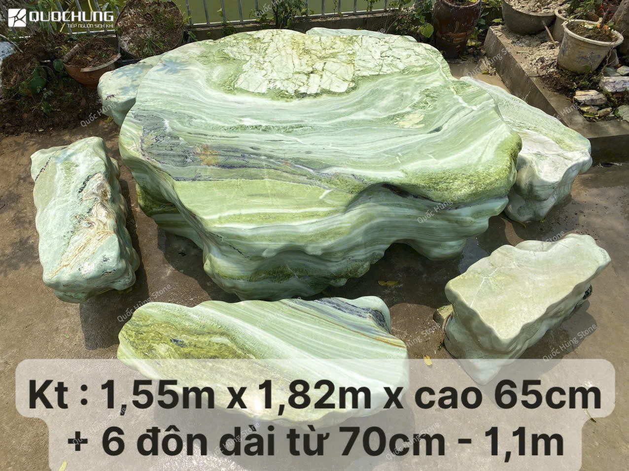 Bộ bàn ghế đá serpentine tự nhiên nguyên khối được chế tác từ những khối đá lớn, giữ nguyên vẻ đẹp tự nhiên vốn có. Sự đồng nhất từ màu sắc đến vân đá tạo nên sự ấn tượng mạnh mẽ, vừa sang trọng vừa gần gũi với thiên nhiên.