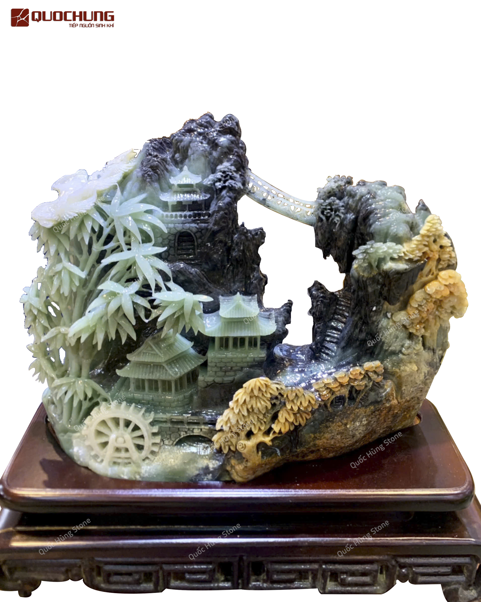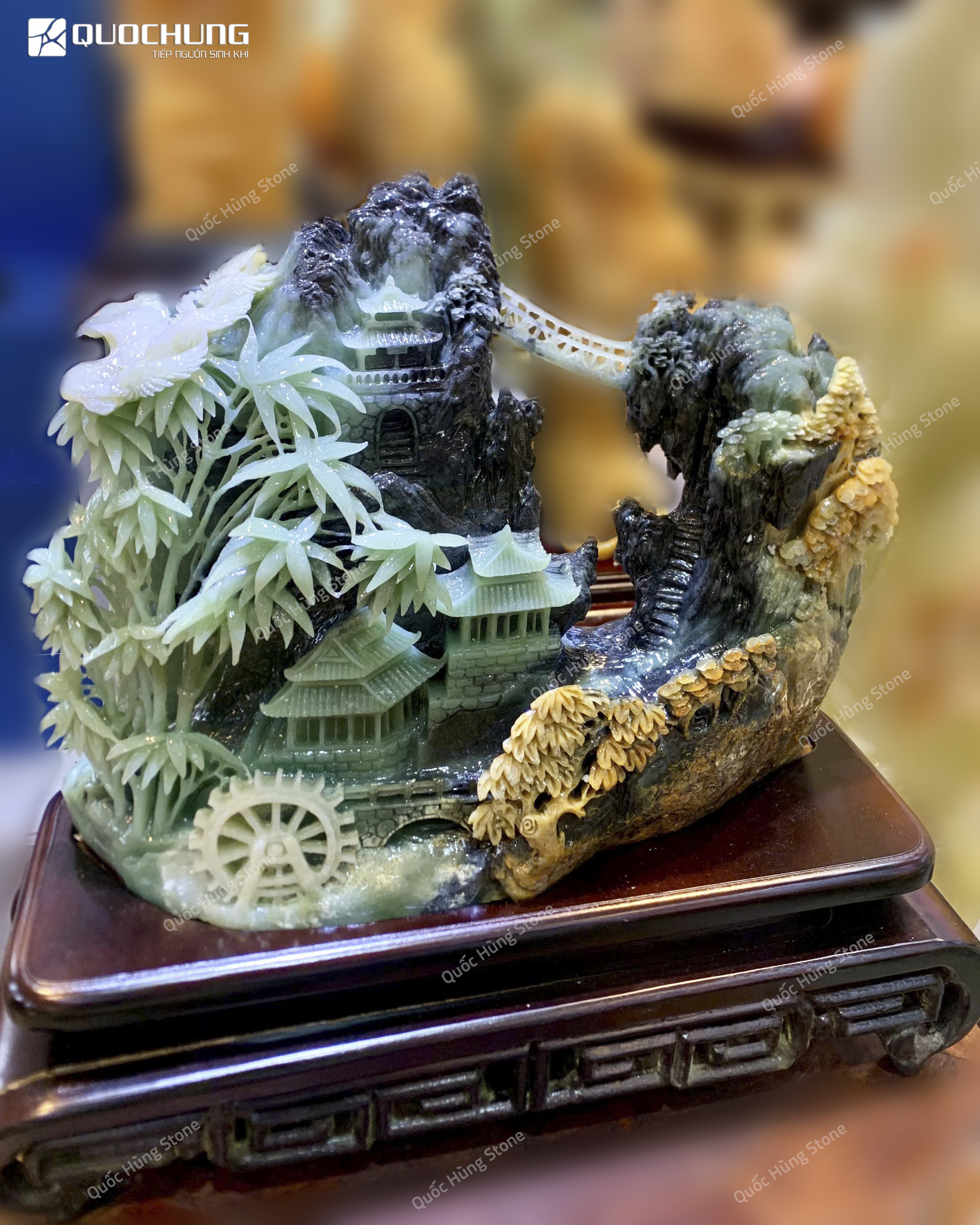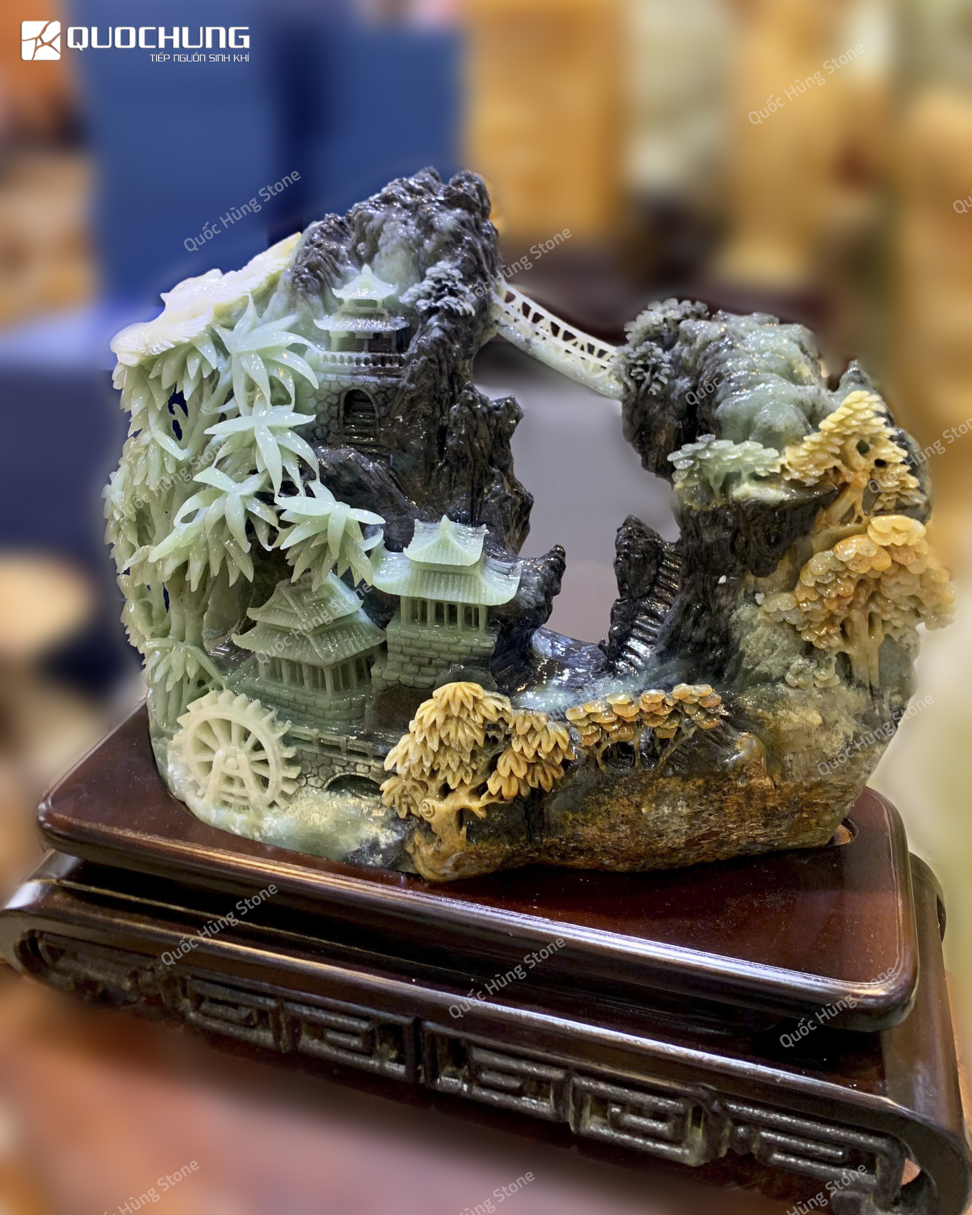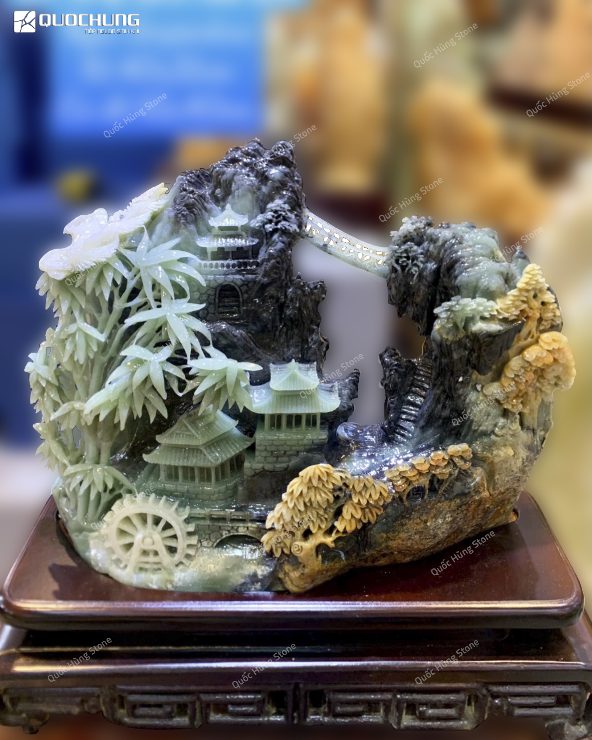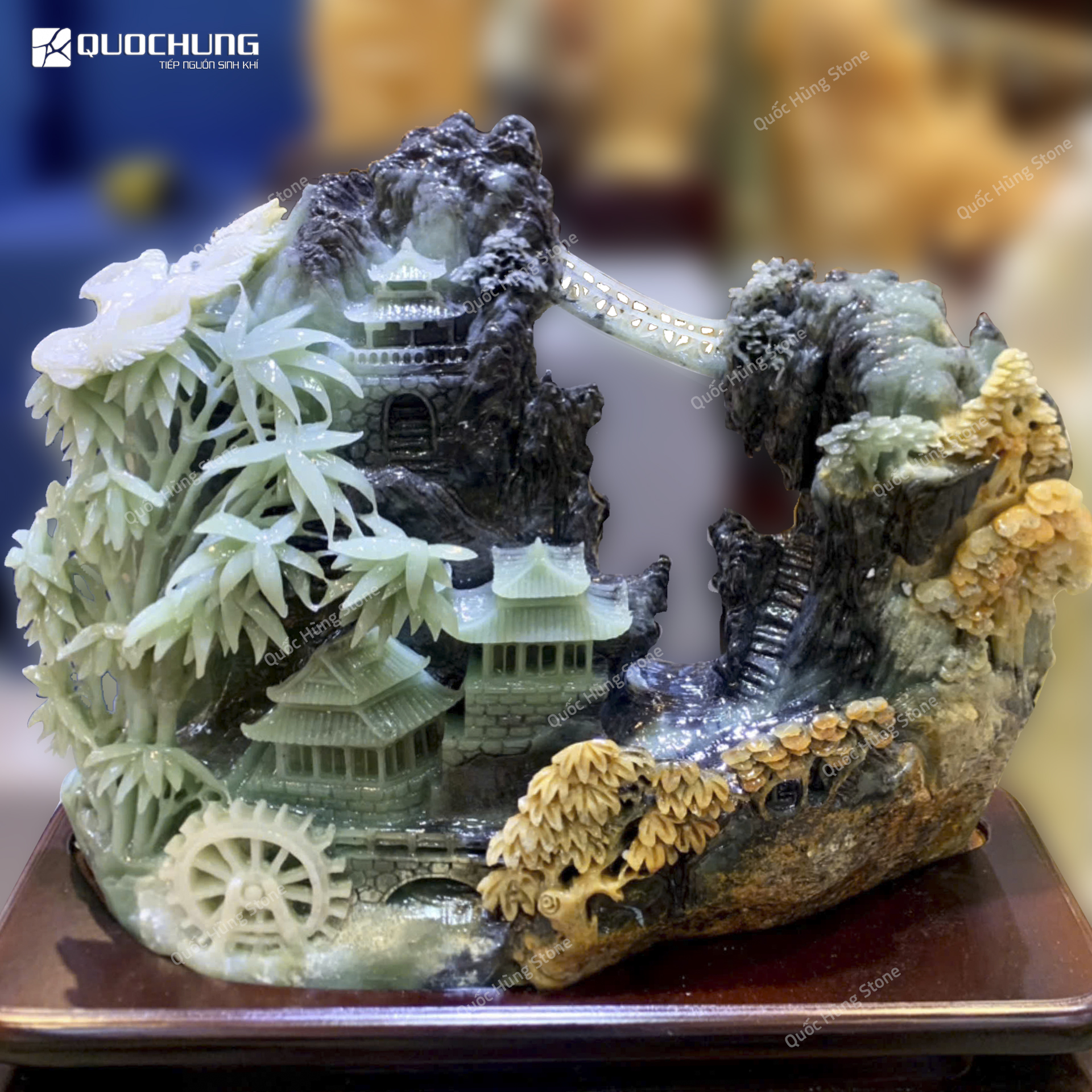 Tác phẩm "Phong Cảnh Hữu Tình" được chạm khắc tinh xảo từ Ngọc Serpentine, tái hiện khung cảnh thiên nhiên sống động và hữu tình. Màu sắc tự nhiên của ngọc Serpentine tạo nên sự hài hòa, mang đến cảm giác thư thái và bình yên cho không gian trưng bày. Đây là lựa chọn hoàn hảo cho những ai yêu thích nghệ thuật đá cảnh và muốn sở hữu một tác phẩm vừa mang ý nghĩa phong thủy, vừa thể hiện sự tinh tế và đẳng cấp