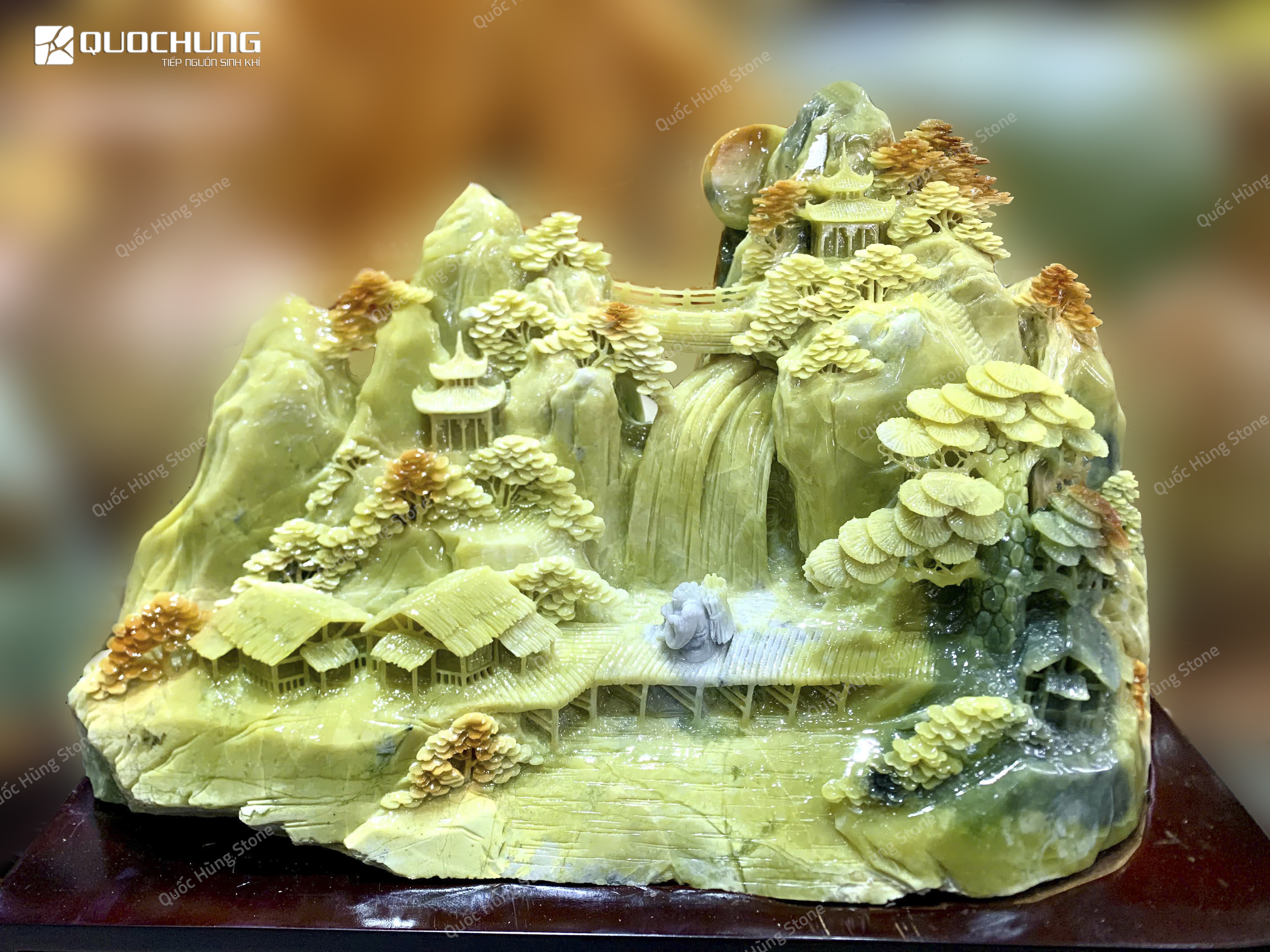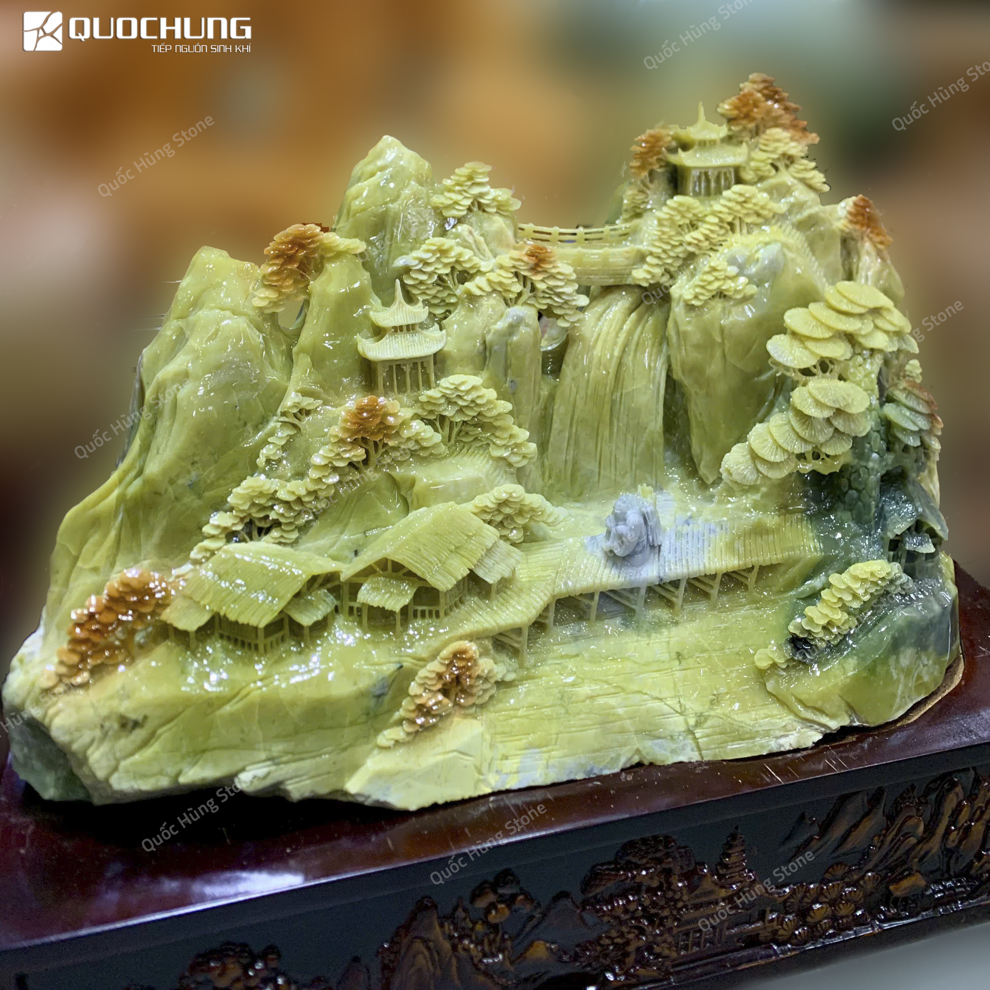 Nếu bạn muốn sở hữu Tác Phẩm Phong Cảnh Hữu Tình Ngọc Serpentine chất lượng cao, hãy đến với Quốc Hùng Stone. Quốc Hùng Stone là lựa chọn hàng đầu, đây là đơn vị chuyên cung cấp đá phong thủy với các ưu điểm nổi bật: