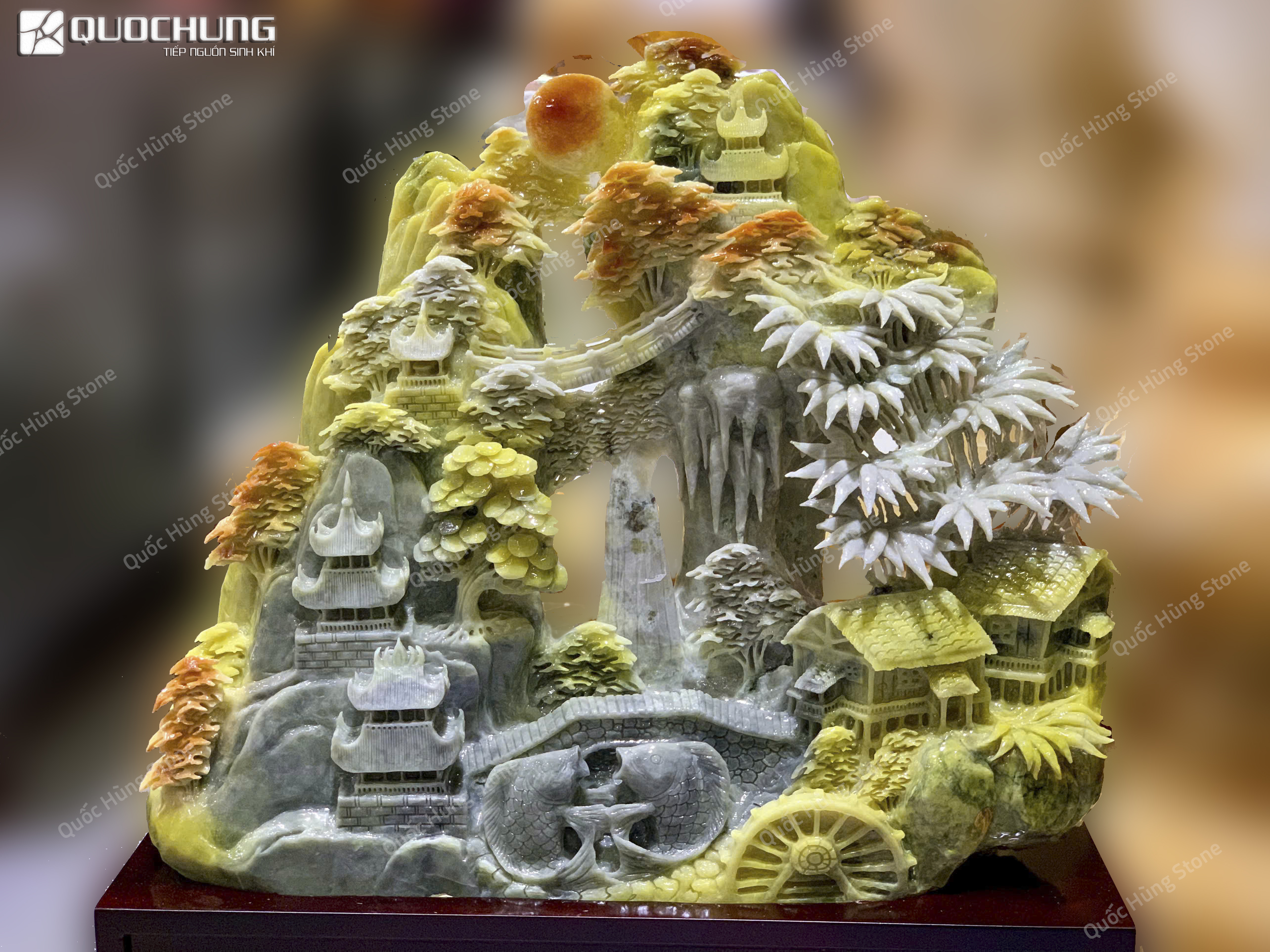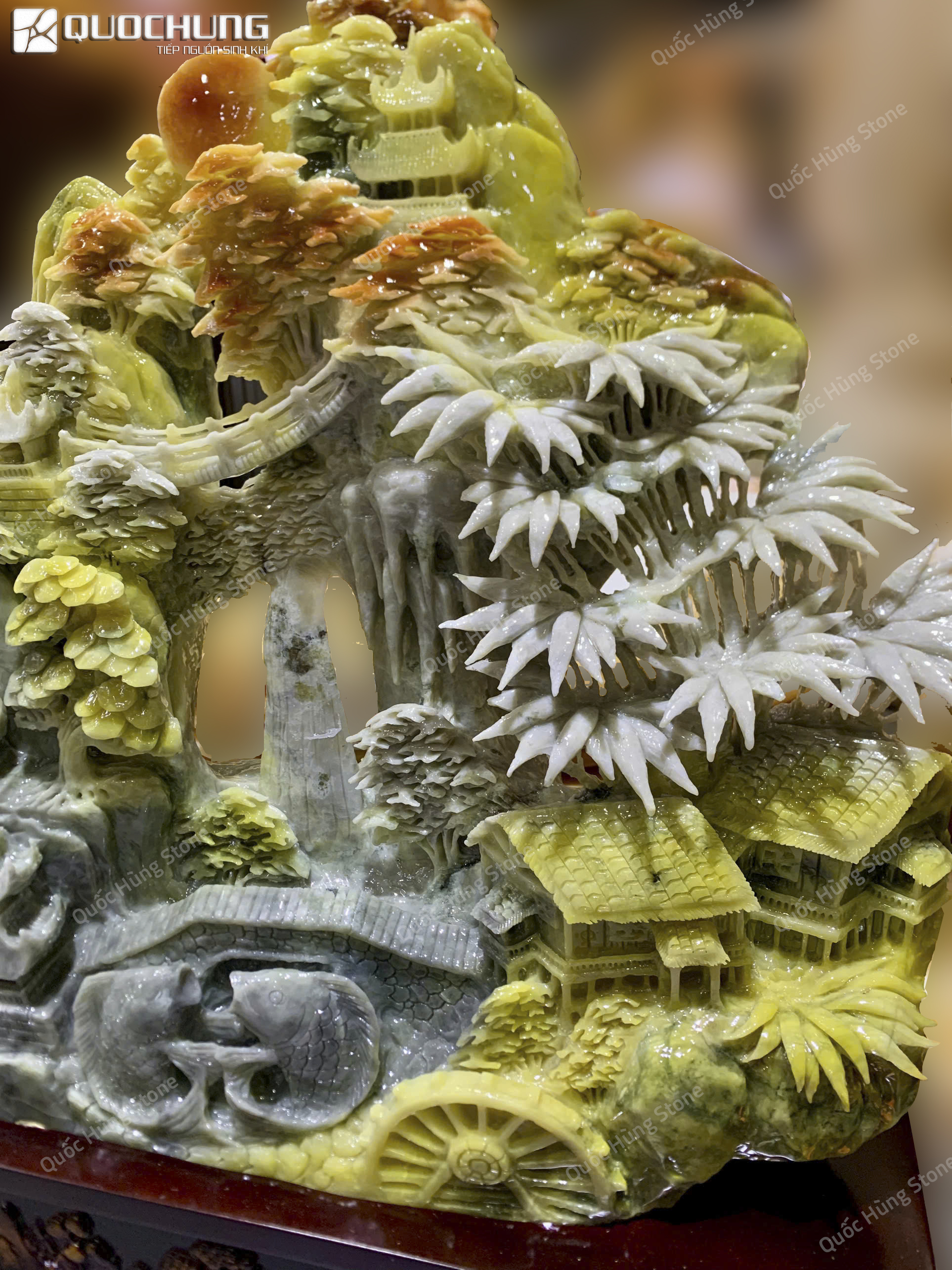 Tác Phẩm Phong Cảnh Hữu Tình không chỉ là một sản phẩm nghệ thuật mà còn là sự kết hợp hoàn hảo giữa tay nghề của nghệ nhân và vẻ đẹp tự nhiên của đá Ngọc Serpentine. Những đường nét tinh xảo khắc họa cảnh sắc thiên nhiên thơ mộng, từ dòng suối uốn lượn, rặng núi hùng vĩ đến cánh rừng tươi xanh, tạo nên một bức tranh sống động và tràn đầy cảm xúc.