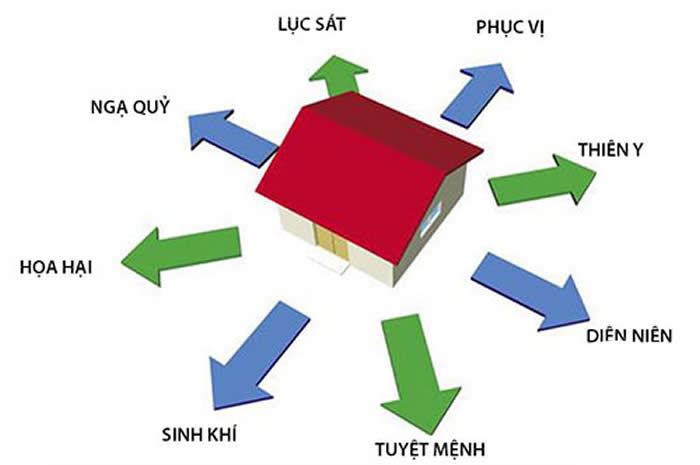 Theo trường phái Bát Trạch trong phong thủy, mỗi người thuộc một nhóm trạch mệnh (Đông Tứ Trạch hoặc Tây Tứ Trạch) sẽ có những hướng nhà tốt và xấu khác nhau. Các hướng xấu thường gặp bao gồm Tuyệt Mệnh, Ngũ Quỷ, Lục Sát và Họa Hại. Đây là những hướng dễ mang đến xui xẻo, bất ổn cho sức khỏe, công việc và mối quan hệ gia đình.